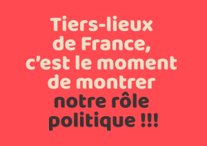 Dans ce contexte, plusieurs acteurs continuent d’affirmer le rôle politique des tiers-lieux dans la société, voire leur rôle de lanceur d’alerte. Ils se saisissent d’enjeux sociaux et écologiques afin de préserver le tiers-lieu(x) comme un espace démocratique. Pour ces acteurs, les tiers-lieux doivent permettre à toutes formes d’organisation et à tous les individus — habitants, élus, etc. — de se réunir, partager leurs préoccupations et d’assurer les conditions de leur subsistance.